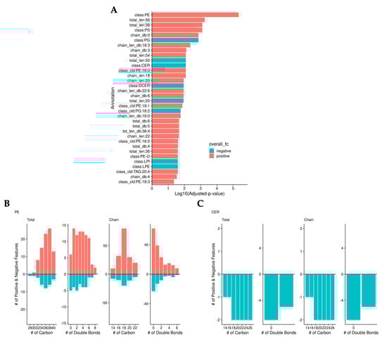 Bilirubin nanoparticles regulate phosphatidylethanolamine (PE) and ceramide (CER) levels within the liver of obese mice. (A) Log10(adjusted-p-values) from binomial tests of lipid annotations. Color represents whether there are more positive (red) or negative (blue) log-fold-change lipids. The number of positive (red) and negative (blue) LogFC lipids is determined by the total and chain numbers of carbon and double bonds in PE (B) and CER (C).