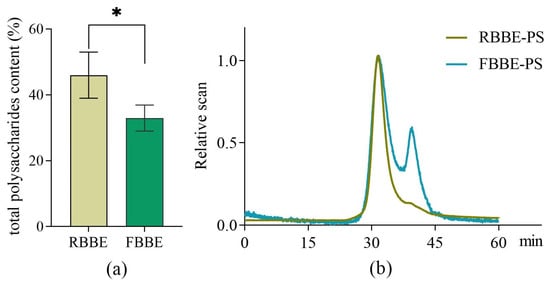 Effects of fermentation on the content of total polysaccharides in barley bran (a) and the HPSEC-RI-MALLS chromatograms (b) of polysaccharides from unfermented (RBBE-PS) and fermented barley bran extract (FBBE-PS). * p < 0.05.