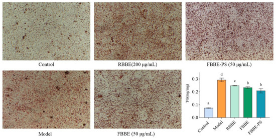 The micrographs (200×) of Oil Red O-stained cells and TG contents in HepG2 cells treated with 200 μg/mL of RBBE, 50 μg/mL of FBBE and 50 μg/mL of FBBE-PS. Data are presented as means ± SD, n = 5, different letters indicate significant differences between groups (p < 0.05).