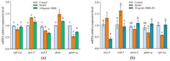 Effects of FBBE (100 μg/mL) (a) and FBBE-PS (50 μg/mL) (b) on the expression of genes related to fat metabolism in HepG2 cells. Data are presented as means ± SD, n = 3, different letters indicate significant differences between groups (p < 0.05).