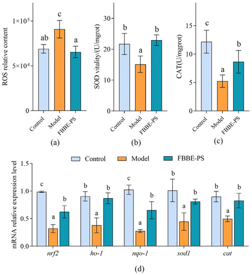 Effects of FBBE-PS (50 μg/mL) on intracellular ROS levels (a), SOD activity (b), CAT activity (c) and expressions of antioxidation-related genes (d) in HepG2 cells. Data are presented as means ± SD, n = 3, different letters indicate significant differences between groups (p < 0.05).