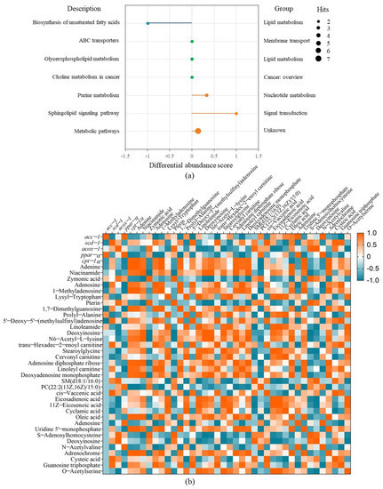 The differential abundance score diagram of FBBE-PS group vs. the model group for metabolic pathway analysis (a) and the correlation analysis between metabolites and lipid metabolism genes (b).