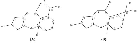 (A) Skeletal structure of myrsinanes; (B) Skeletal structure of premyrsinanes.