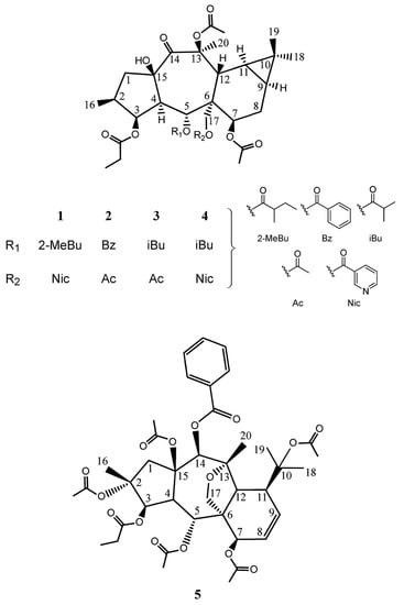 - 2,5,7,10,15-O-pentaacetyl-3-O-propanoyl-14-O-benzoyl-13,17-epoxy-8-myrsinene (5): colorless oil; for 1H and 13C NMR data, see Table 2; HR-ESI-MS m/z 793.20 [M+Na]+. For additional spectra, refer to the Supplementary Materials, Figures S29–34.