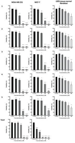 Cytotoxicity activity by using MTT viability assay against MCF-7, MDA-MB231, and L929 normal cell lines. These cells were treated with various concentrations of compounds 1–5 and Taxol as the positive control. Results are presented as the mean ± SD (n = 3). * p < 0.05, ** p < 0.01, *** p < 0.001, and **** p < 0.0001 versus control group.
