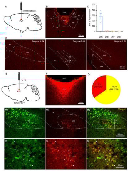 Next, to clarify the types of neurons that ZIR projects to PVT, we applied the retrograde tracer cholera toxin B subunit (CTB) into PVT of glutamic acid decarboxylase-green fluorescence protein (GAD67-GFP) knock-in mice (Figure 1E). We found that there were many GFP-labeled positive neurons in ZI of GAD67-GFP mice, consistent with the data for glutamic acid decarboxylase 2 (GAD2) mRNA distribution shown in the Allen Brain Atlas (http://www.brain-map.org) (accessed on 1 January 2023). The retrograde neurons double-labeled with CTB/GFP were observed in ZIR (Figure 1H1–I3). The results showed that approximately 72.2% of the CTB-labeled were co-expressed with GFP in ZIR (Figure 1G), suggesting that most neurons in ZIR project to PVT are GABAergic.