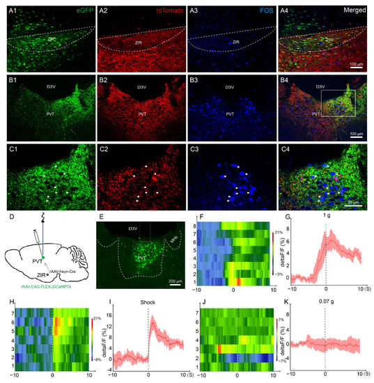 We bred GAD2-cre mice with Ai9 reporter mice, in which the GAD2+ neurons were labeled with tdTomato. To investigate whether the ZIR–PVT pathway is involved in nociceptive transmission, we injected rAAV-hSyn-eGFP into the right ZIR of GAD2-Ai9 mice (Figure 2A1–A4). Three weeks later, the mice were applied with 4% formalin (20 μL) in the left hind paw [14], and perfused after 2 h. Fos protein (FOS) is widely used as a biomarker of early neuronal activation in relation to the pathophysiology of pain [22,23]. Immunohistochemical staining showed that in response to nociceptive stimuli, many FOS-positive neurons were observed in PVT (Figure 2B3). The anterogradely labeled axonal terminals (green) from the ZIR showed GAD2-positive (red), and made close connections with the FOS positive neurons (blue) in PVT (Figure 2C1–C4). These data indicate that the activated PVT neurons receives GABAergic projections from the ZIR in nociception.