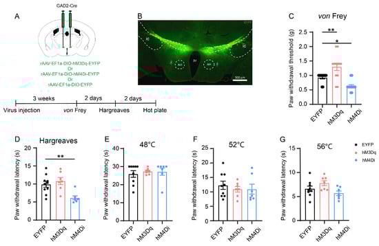 We also examined the thermal hyperalgesia in chemogenetic activation/inhibition. In Hargreaves test, the latency of the withdrawal thresholds in the hindpaw was significantly reduced in the hM4Di group after clozapine injection compared with the control group (hM4Di-Clozapine vs. EYFP-Clozapine: p = 0.0070, Figure 3D), whereas no significant difference was observed in the hM3Dq group (hM3Dq-Clozapine vs. EYFP-Clozapine: p = 0.6524). Another type of thermal nociception measured by hotplate test was not changed, indicating that thermal pain could be partial influenced by chemogenetic inhibition of the ZIR GABAergic neurons (48 °C: hM3Dq-Clozapine vs. EYFP-Clozapine: p = 0.7617, hM4Di-Clozapine vs. EYFP-Clozapine: p = 0.8220; 52 °C: hM3Dq-Clozapine vs. EYFP-Clozapine: p = 0.7247, EYFP-Clozapine vs. hM4Di-Clozapine: p = 0.7336; 56°C: hM3Dq-Clozapine vs. EYFP-Clozapine: p = 0.2236, hM4Di-Clozapine vs. EYFP-Clozapine: p = 0.3708, Figure 3E–G).