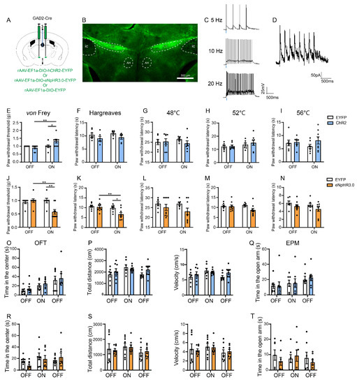 Inversely, optogenetic inhibition of the ZIRGABA+–PVT pathway with yellow light (589 nm, 5 mW) induced mechanical hypersensitivity (Light on vs. Light off in the eNpHR3.0 group: p = 0.0016; EYFP vs. eNpHR3.0 in the Light-on state: p = 0.0033, Figure 4J). Inhibition of the ZIRGABA+–PVT pathway also significantly decreased the latency withdrawal thresholds in Hargreaves test (Light on vs. Light off in the eNpHR3.0 group: p = 0.0063; EYFP vs. eNpHR3.0 in the Light-on state: p = 0.0356, Figure 4K). However, the results from hotplate test did not show any significant differences (48 °C: Light on vs. Light off in the eNpHR3.0 group: p = 0.8614, EYFP vs. eNpHR3.0 in the Light-on state: p = 0.8614; 52 °C: Light on vs. Light off in the eNpHR3.0 group: p = 0.2356, EYFP vs. eNpHR3.0 in the Light-on state: p = 0.0901; 56 °C: Light on vs. Light off in the eNpHR3.0 group: p = 0.6646, EYFP vs. eNpHR3.0 in the Light-on state: p = 0.4353, Figure 4L–N).