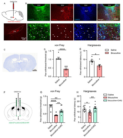 3.5. The ZIRGABA+–PVT Pathway Modulates Nociception through GABA-A Receptor (GABAAR)-Expressing Neurons in PVT