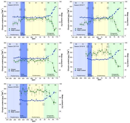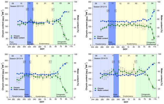 The course of the chrysin and water content in the buds (Figure 1) showed an almost parallel course over 9 years, between leaf fall (LF) and beginning of ontogenetic development (t1*). From the swollen bud stage (SB) on, the water content in the buds rose continuously from ~60% to ~80% at OC, while the chrysin content decreased significantly (p ≤ 0.05) in the opposite direction by ~60% from 185.7 μg/(g DW) to 76.2 μg/(g DW) at OC (Table 1).