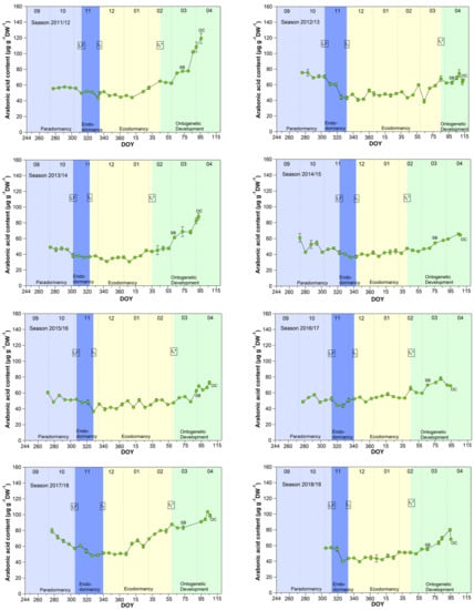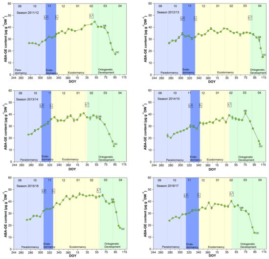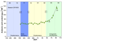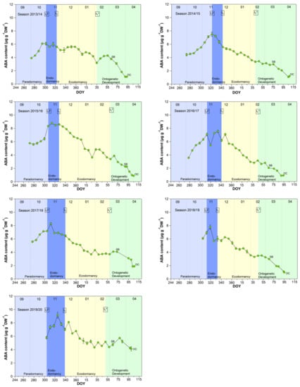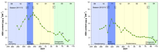 Although abscisic acid only shows a clear change in the temporal course after the date of endodormancy release (Figure 5), it appears to be the key metabolite explaining t1 and t1* [2]. The physiological importance of ABA in the regulation of seed dormancy and seed development has been documented for decades [30,31,32,33,34], in the meantime, it is accepted that ABA during winter has a growth suppressing function in fruit trees. Physiological, metabolomic and transcriptomic studies have proposed the role for ABA in the inhibition of bud “activity” during winter rest [15,18]. Abscisic acid seems to have an important function in the establishment of endodormancy, as the blocking of cell-to-cell communication is mediated by ABA [35]. For sweet cherry cultivars, it has been reported that the ABA content is low before dormancy onset and shows a good match to the date of dormancy release [15]. Similar results were found for peach and pear [36,37].