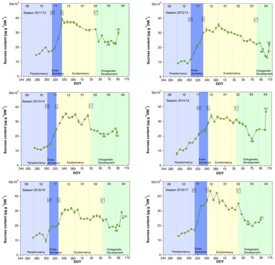 As shown for five years [27], now also in a further four years, the sucrose content in buds strongly rose during the endodormancy phase (LF–t1) and reached its highest, nearly constant value during ecodormancy (Figure 4). With the beginning of ontogenetic development, it decreased nearly until the SB and subsequently rose again until the TC or OC phases. During nine years, the sucrose content started to increase stepwise from first sampling S1-LF, but mainly during endodormancy from 14.5 (LF) to 26.6 mg/(g DW) at t1. The highest mean sucrose content of 27.7 mg/(g DW) was observed during ecodormancy, ranging between 9.1 mg/(g DW) in 2019/20 and 35.8 mg/(g DW) in 2016/17. The low sucrose content in 2019/20 was related to a very mild winter. The average winter temperature in this year was 5.4 °C (mean 2.8 ± 1.5 °C), the mildest winter in nine years. As the result, we found a strong correlation between the mean air temperature and the sucrose content during ecodormancy (r = −0.81, p ≤ 0.01, n = 9), which confirms the cryoprotective role of sucrose in the flower buds but also in other plant organs, as already stated in [16,27,28,29].