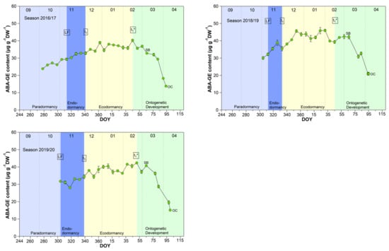 The mean ABA-GE content reached 33.4 μg/(g DW) during the endodormancy phase and increased significant (p ≤ 0.05) to a stable content of about 39.0 μg/(g DW) during ecodormancy and the phase t1*–SB (Table 1, Figure 6). In the phase SB-OC, the ABA-GE content decreased by ~36% to 24.6 μg/(g DW), the lowest content during observation. The mean ABA-GE content in the buds was at all phenological stages (LF, t1, t1*, SB, OC, respectively, 4.7, 5.2, 11.8, 12.5, 11.4-fold), as well as during endo-, ecodormancy phase and the ontogenetic development (LF-t1, t1–t1*, t1*-SB, SB-OC, respectively, 4.7, 8.3, 12.3, 12.6-fold) higher than the ABA content. Because hydrolysis of ABA-GE releases free ABA, ABA-GE can be considered as a readily available storage pool in cherry buds.
