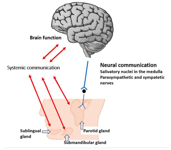 Salivary glands work as an exocrine (external secretions as saliva) and endocrine organ. Some of the salivary products are transferred into the bloodstream via endocrine mechanisms and communicate with other organs, including the brain (Figure 1) [14]. Hence, saliva is an accessible source of information as a ‘mirror of the body’ and a promising biofluid for the diagnosis and monitoring of human diseases because of its bidirectional mechanisms. Furthermore, in contrast to blood or CSF, the collection of saliva is non-invasive and safe.