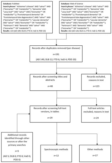 A literature search of suitable studies was conducted using the PubMed and Web of Science databases, utilizing the following keywords: ”Alzheimer’s disease” AND “saliva*” AND (“biomarker*” OR “metabolite*”); “dementia” AND “Lewy bod*” AND “saliva*” AND (“biomarker*” OR “metabolite*”); (“frontotemporal dementia” OR “frontotemporal lobe degeneration”) AND “saliva*” AND (“biomarker*” OR “metabolite*”); “vascular dementia” AND “saliva*” AND (“biomarker*” OR “metabolite*”); “Parkinson’s” AND “dementia” AND “saliva*” AND (“biomarker*” OR “metabolite*”). The search was performed without the limitations of publication year. The searches were conducted in December 2021. Additional searches (n = 5) were conducted until October 2022.
