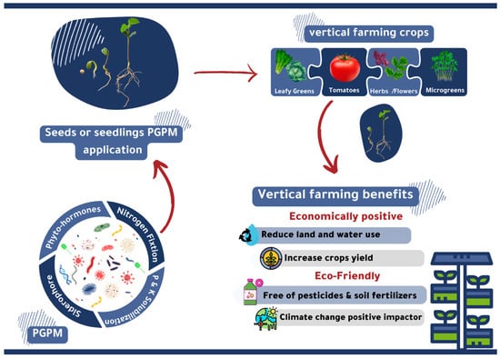 Considering that plant growth-promoting microorganisms (PGPMs) have been known for decades to enhance plant health and increase productivity [1,2,3,4,5,6,7,8,9,10,11], the questions are “what is the added value for PGPM incorporation in vertical farming or hydroponics?” and “what is the best mode of use considering a soil-free system?”