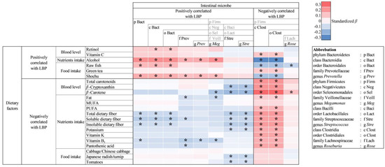 Multiple regression analysis was conducted using plasma LBP concentration as the objective variable; dietary factors as the explanatory variable; and age, sex, BMI, smoking habit (current habitual smoker or not), drinking habit (current habitual drinker or not), and energy intake as adjustment factors (Table S6). Only categories that were significantly associated with plasma LBP concentrations are selected in Table 4. Results showed that plasma LBP concentration was positively correlated with six dietary factors and negatively correlated with 16 dietary factors. Specifically, plasma LBP concentration was positively correlated with serum retinol concentration, plasma vitamin C concentration, alcohol intake, shochu intake, raw fish intake, and green tea intake. Additionally, plasma LBP concentration was negatively correlated with serum total carotenoid concentration, serum β-cryptoxanthin concentration, serum β-carotene concentration, fat intake, monounsaturated fatty acid (MUFA) intake, polyunsaturated fatty acid (PUFA) intake, dietary fiber intake (total dietary fiber, soluble dietary fiber, insoluble dietary fiber), potassium intake, vitamin K intake, vitamin B1 intake, pantothenic acid intake, cabbage/Chinese cabbage intake, Japanese radish/turnip intake, and tomato intake.