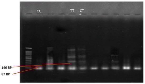 The MTHFR C677T (rs1801133) gene polymorphism was amplified and genotyped using Tetra–ARMS PCR method. Three different kinds of MTHFR C677T (rs1801133) genotypes (TT, CT, and CC) were confirmed via PCR results after the confirmation of the gel documentation results. In a single PCR reaction, each sample’s genomic DNA was amplified using the set of two forward (inner and outer) and two reverse (inner and outer) primers. The band size of 87 bp was for the C allele, for the outer primer and the inner primer. Meanwhile, the 146 bp band was for the other inner and outer primer for the T allele. The PCR product was viewed under UV light after gel electrophoresis as shown in Figure 2.