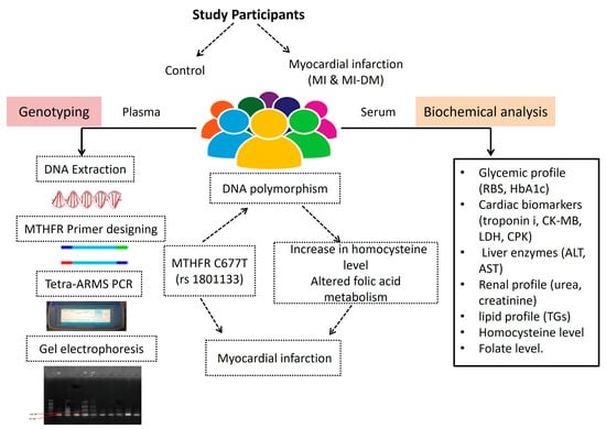 A schematic representation of this study is shown in Figure 3. Our data showed that in the MI and MI with diabetes (MI-DM) study groups, there was an increase in homocysteine levels when compared with the controls. Furthermore, the folate level was decreased in MI and MI with diabetes (MI-DM) study groups.