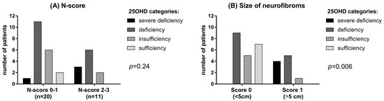(A) 25OHD level in patients with different N-score. (B) 25OHD in patients with neurofibromas of different dimension.