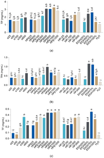 Content of total (a) phenolic compounds (TP), (b) phenolic acids (TPA), and (c) flavonoids (TF) in preliminary H. italicum extracts. The abbreviated extract names are presented in Table 1. The experiments were performed in triplicate. The amounts are shown as mean ± SD. a–l = differences between the extracts within a column (Tukey post-test, p < 0.05). Values not connected with the same letter are statistically different.