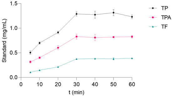 Further CDAE optimization steps were performed using UAE, a technique with diverse applications in food science. Due to its role in environmental sustainability, ultrasonication is widely used in industries and is referred to as a “green unique technology” [33]. For example, UAE is one of the most practical techniques for large-scale industrial production of algal polysaccharides due to its simplicity, increased yield, high efficiency, and low cost [34]. In addition, high reproducibility, low solvent consumption as well as a fast extraction rate render UAE highly appropriate for the extraction of chemically sensitive bioactive natural compounds, such as polyphenols [35,36]. In order to estimate the optimal duration of UAE with HP-β-CD aqueous solutions, the kinetics of TP, TPA, and TF extraction were studied (Figure 2). As observed, after 30 min the concentration of the target compounds remained constant (TP and TPA) or even slightly decreased. Thus, 30 min was chosen as the extraction time in the following steps.