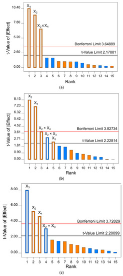 In order to single out the independent variables that significantly affect the responses, Pareto charts were used. Pareto charts depend on the standard deviation to estimate the sampling errors of variables. Each chart depicts two important limits: the Bonferroni limit and t-value limit. Variables with coefficients above the Bonferroni limit are considered significant model factors, while the variables that fall between the Bonferroni and the t-value limit are considered likely to be significant. Finally, the coefficients below the t-value limit are the variables that do not significantly affect the extraction efficiency [46]. Positive and negative effects of independent variables on the dependent ones are indicated by the orange and the blue color on the charts, respectively.