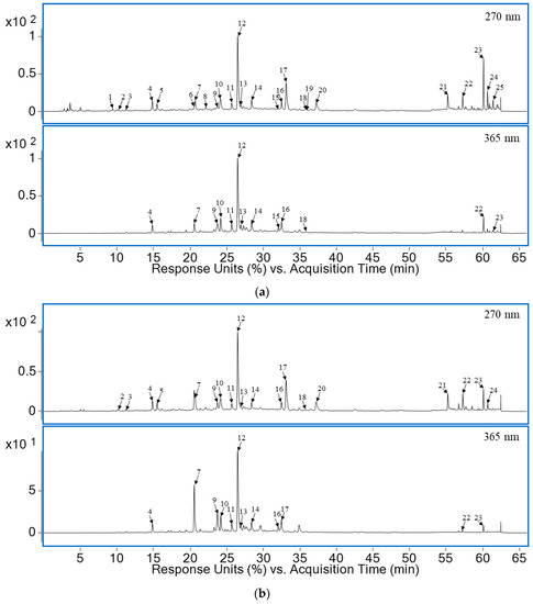 UV chromatograms of (a) OPT 1 and (b) OPT 2 extracts obtained by LC-PDA-MS. The compound labels are explained in Table 7.