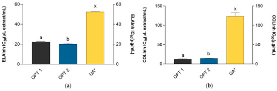 Inhibitory activity of the extracts and corresponding positive controls: ursolic acid (UA) and gallic acid (GA) on (a) elastase and (b) collagenase. The activities are shown as IC50 values ± SD. a, b = differences between the extracts within a column (t-test, p < 0.05). x = differences with the positive control (Dunnett’s post-test, p < 0.05). Columns not connected with the same letter are statistically different. Asterisk indicates that the unit is placed at the right ordinate.
