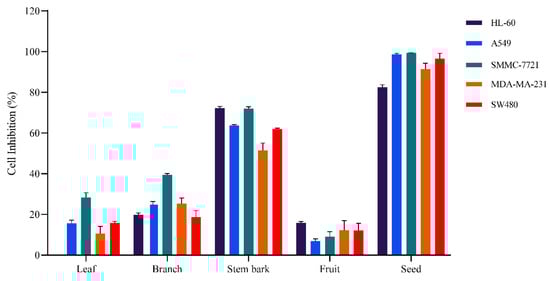 Five human cancer cell lines (HL-60, A549, SMMC-7721, MCF-7, and SW480) were cultured with different parts (leaf, branch, stem bark, fruit, and seed) of G. xanthochymus crude methanol extracts at 100 μg/mL. MTS assays were performed to measure the cell viability in the culture medium. The proportions of 70% methanol extract of different parts were evaluated for their cell inhibition against five human cancer cell types (Figure 1). The seed extract had the most significant cytotoxic effects on five cancer cell types. In contrast, the leaf, branch, and fruit extracts had no significant effect on the cell viability. These cytotoxicity studies demonstrated that the seed methanol extracts were the most active. Moreover, the cytotoxicity of these extracts against five human cancer cell lines is shown in Table 1. The 70% methanol seed extract had a good cytotoxic effect on HL-60, A549, SMMC-7721, MDA-MA-231, and SW480, with IC50 values of 8.637 ± 0.124, 3.436 ± 0.169, 2.666 ± 0.130, 8.362 ± 0.562, and 9.438 ± 0.290 μg/mL, respectively. These results demonstrated that the cytotoxic activity of the 70% methanol seed extract from G. xanthochymus underwent reasonable bioactivity-guided fractionation to identify the cytotoxic activity compounds.
