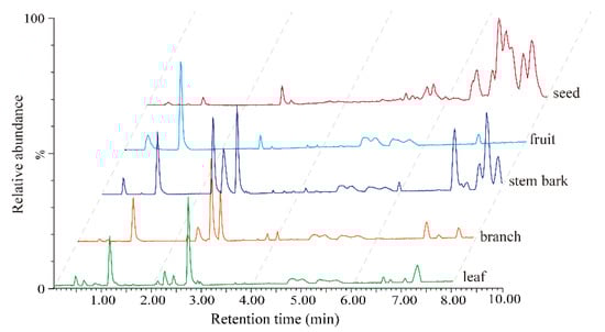 The leaf, branch, stem bark, and seed were naturally air-dried, and the fruit was freeze-dried. All dried samples were grounded into a powder and extracted with 70% methanol followed by ultrasonic extraction at room temperature for 30 min. Each sample was extracted three times with the same method; the filtrate was concentrated in a vacuum with a rotary evaporator to obtain dry residues of different parts that were then stored at 4 °C until their use. The extracts were dissolved with chromatographic-grade methanol to obtain a concentration of 1 mg/mL of crude extract, and were filtered through a 0.22 µm PTFE syringe filter and transferred into a 2 mL autosampler vial for UPLC-QTOF-MS analysis. The quality control (QC) sample was prepared by mixing 50 μL of each methanol solution with different part extracts.
