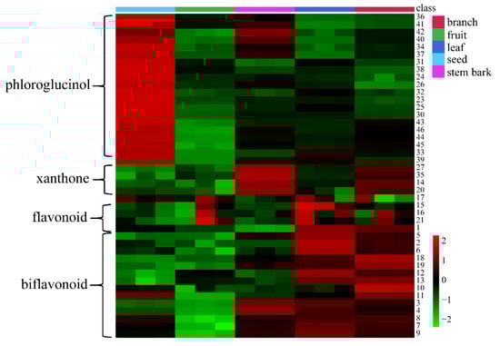 The heatmap representation was used on the basis of the peak areas of the identified metabolites. There were significant differences in the expressions of metabolites between different parts of G. xanthochymus (Figure 3). All metabolites were divided into two categories; the red type indicated that the metabolites were relatively high in content. The distribution of metabolites in different parts of G. xanthochymus was generally partitioned into four groups: phloroglucinols, xanthones, flavonoids, and biflavonoids. Phloroglucinols were present in the highest levels in the seed, with low content in the branch, leaf, stem bark, and fruit. For example, the compounds garcinielliptone F, garcinielliptone T, and garsubellin B were present in significant quantities in the seed. Meanwhile, xanthones were mainly present in the stem bark and branch, but the content was lower in other parts. Biflavonoids and flavonoids were present in higher levels in the leaf, but the expression levels in other parts were relatively low. The study on the metabolic profiles of G. xanthochymus enabled us to discover that the seeds were rich in phloroglucinol compounds, most of which were reported in this plant for the first time. In general, based on the heatmap analysis, we could intuitively observe different kinds of chemical components and their content levels in the branch, leaf, stem bark, seed, and fruit of the plant.