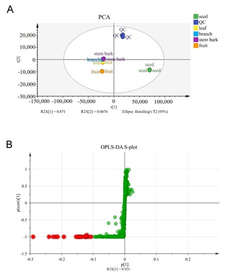Multivariate analysis of different parts of G. xanthochymus. (A) Score plot from PCA (negative). (B) S-plot from OPLS-DA (negative). Compounds putatively identified in Table 2 are highlighted.