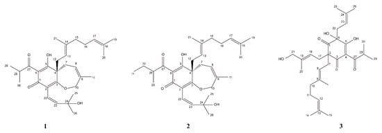 - Forino, M.; Pace, S.; Chianese, G.; Santagostini, L.; Taglialatela-Scafati, O. Humudifucol and Bioactive Prenylated Polyphenols from Hops (Humulus lupulus cv. “Cascade”). J. Nat. Prod. 2016, 79, 590–597. [Google Scholar] [CrossRef] [PubMed]