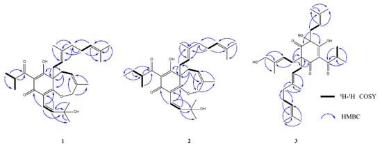 The key 1H-1H COSY and HMBC correlations of 1–3.
