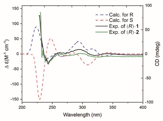 Experimental CD spectrum of 1–2 and simulated CD spectra corresponding to the R (blue curve) and S (red curve) enantiomers of 1–2 as calculated.