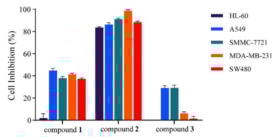 Cytotoxicity assay of compounds 1–3 against five human cancer cell lines (HL-60, A549, SMMC-7721, MCF-7, and SW480) at concentrations of 40 μM. Results are expressed as mean ± SD (n = 3).