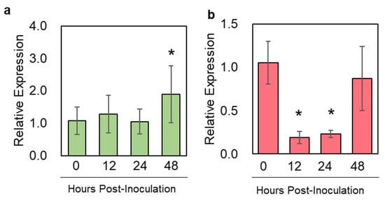In both N. benthamiana and S. lycopersicum, the genes encoding functional SQS enzymes were characterized [34,35]. We designed paralog-specific primers to measure the expression dynamics of NbSQS upon P. infestans infection with a q-RT-PCR. In the results, the expression of NbSQS was significantly induced (Fold Change > 1.8) at 48 h post-inoculation (hpi) but not during earlier phases of infection (Figure 2a). In contrast, SlSQS expression was significantly suppressed at 12 and 24 hpi (Fold Change > 5 at both time points) and returned to its pre-inoculation level at 48 hpi (Figure 2b). These results demonstrated a host-specific transcriptional regulation of SQS during P. infestans infection.