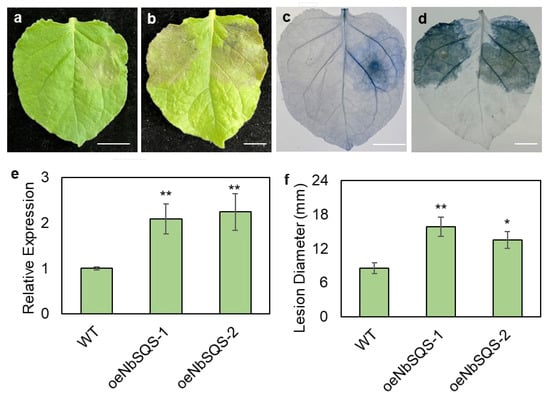 SQUALENE-SYNTHASE-overexpressing N. benthamiana plants are more susceptible to P. infestans. Symptoms of P. infestans inoculation on detached leaves of wild type (a,c) and oeNbSQS (b,d) plants under normal conditions (a,b) or after trypan blue staining (c,d). Scale bar (a–d) is 1 cm. Expression of NbSQS measured by q-RT-PCR; error bars = standard deviations (e). Lesion diameters on wild type and two independent oeNbSQS lines measured at 7 days post-inoculation; error bars = standard errors (f). Statistically significant differences from wild types calculated with Student’s t-tests (* p < 0.05, ** p < 0.01; N = 5 for q-RT-PCR; N > 24 for lesion diameter measurement).