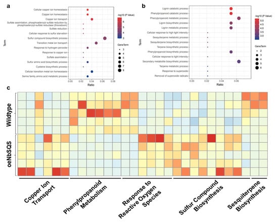 Comparative transcriptomic analysis of wild type and SQUALENE SYNTHASE-overexpressing N. benthamiana leaves. Gene ontology enrichment analysis results of up-regulated (a) and down-regulated (b) genes in oeNbSQS plants. Normalized expression heatmap of differentially expressed genes belonging to the gene ontology terms (c).