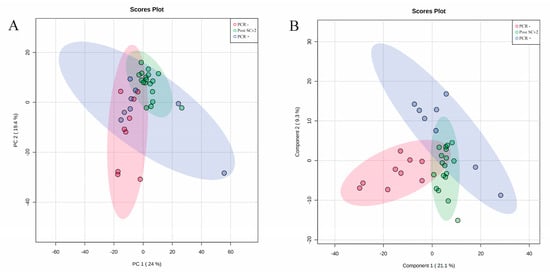(A) PCA; and (B) PLS-DA comparing subjects from PCR−, PCR+, and post-SARS-CoV-2 infection (post-SCv2).