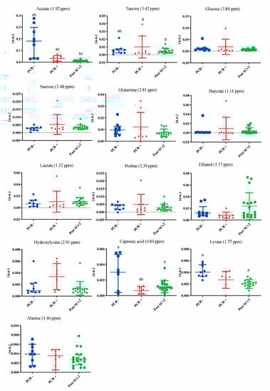 Amino acids that presented statistical differences (p < 0.05) in the univariate analysis for the groups PCR−, PCR+, and post-SARS-CoV-2 infection (post-SCv2). The metabolites that presented statistical differences in the univariate analysis (Supplementary Figure S1) are indicated using letters; the same letter indicates a statistical difference.