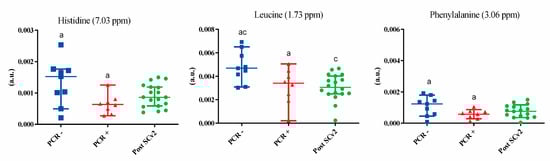Supplemental Table S1 shows salivary metabolites, chemical shifts, peak intensity variations, and p-values resulting from multivariate and univariate analyses. Figure 2 shows the metabolites that were highlighted in the VIP score, demonstrating an important variation within groups, especially in PCR− group, and in PCR+ was observed more outliers. These data indicate seventeen different assigned chemical shifts with a statistical difference of at least between two groups. Amino acids such as glutamine, proline, and lysine presented a downregulation in the PCR+ and post-SARS-CoV-2 infection subjects. Acetate, ethanol, and capronic acid also presented a reduction in PCR+ and post-SARS-CoV-2 infection subjects. Figure 3 exhibits the amino acids (histidine, leucine, and phenylalanine) that presented statistical differences (p < 0.05) in the univariate analysis.