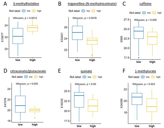 The most differentially expressed metabolites in participants with and without FIB-4 ≥ 1.45. Figure 2 displays metabolites that differed significantly in participants with and without FIB-4 ≥ 1.45 determined by p < 0.05 in Wilcoxon test. FIB-4 score ≥ 1.45 (“high” FIB-4 label) was defined as “unable to exclude advanced liver fibrosis/cirrhosis”. (A) Methylhistidine, beta-alanine, and histidine metabolism; (B) niacin metabolism and biomarker for consumption of coffee, legumes and soy products; (C) biomarker of caffeine consumption; (D) methyl-branched fatty acids involved in lipid transport and metabolism; (E) a crystalline acid obtained from cinchona bark, coffee beans, carrot leaves, apples, peaches, vegetables, etc., that is implicated in the perceived acidity of coffee; (F) the product of the metabolism of methylxanthines (caffeine, theophylline, and theobromine). Abbreviations: FIB-4, Fibrosis-4 Index.