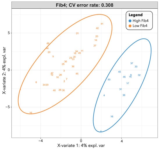 PLS-DA score plot for participants with and without FIB-4 ≥ 1.45. Figure 3 displays the class prediction plot representing bacterial metabolites separating participants with and without FIB-4 ≥ 1.45 the most based on the first two principal components of the PLS-DA model. FIB-4 score ≥ 1.45 (“high FIB-4” label) was defined as “unable to exclude advanced liver fibrosis/cirrhosis”. Each point on the graph represents a participant, with blue circles representing participants with FIB-4 ≥ 1.45 and orange triangles representing participants with FIB-4 < 1.45. Abbreviation: PLS-DA, partial least squares–discriminant analysis.