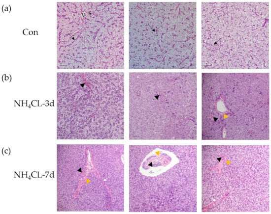 Ammonia exposure affected largemouth bass liver health. Hematoxylin-eosin (H. & e.) staining of paraffin sections of perch liver after ammonia exposure. V: venous tube; S: hepatic sinuses; black arrow: hepatic cord structure; black triangles: infiltration of inflammatory cells; yellow triangle: thickened vascular epithelium; white arrow: hepatic sinus congestion; scale, 50 μm. (a) control group; (b) ammonia exposure for 3d; (c) ammonia exposure for 7 days.