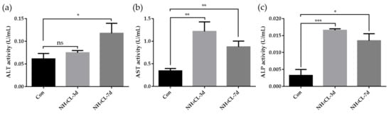 Meanwhile, the enzyme activities of ALT, AST, and ALP activity in the serum of largemouth bass were also determined. As shown in Figure 2, serum ALT activity of largemouth bass was significantly increased after ammonia exposure for 7 days, which was significantly higher than that in the control group (p < 0.05). Ammonia exposure for both 3 days and 7 days induced higher serum AST activity and ALP activity. These results along with the histological results confirmed that ammonia exposure seriously affected the liver health of largemouth bass.