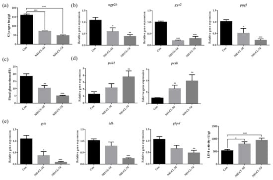 The lactate dehydrogenase (LDH) activities and glycogen content in the liver were also determined with a commercial kit (BC0685 & BC0345, Solarbio, Beijing, China). Briefly, LDH catalyzes NAD+ to oxidize lactic acid to produce pyruvate, and pyruvate further reacts with 2,4-dinitrophenylhydrazine to produce dinitrophenylhydrazone, which is brown-red in an alkaline solution, and the shade of color is proportional to the pyruvate concentration. Similarly, glycogen was extracted with a strong alkaline solution and determined with anthracene chromogenic agent under strong acidic conditions.