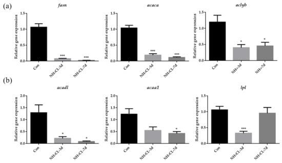Besides carbohydrate metabolism, the hepatic lipid metabolism of largemouth bass after ammonia exposure was also evaluated. As shown in Figure 4a, the expression of fasn, acaca, and aclyb, which are involved in lipogenesis, were significantly down-regulated after ammonia exposure for both 3 days and 7 days. On the other hand, the expression of acadl, which catalyzes the first step in fatty acid β-oxidation, was significantly down-regulated after ammonia exposure for both 3 days and 7 days (Figure 4b). Moreover, the expression of lpl and acaa1 was also significantly down-regulated after ammonia exposure for 3 days and 7 days, respectively.